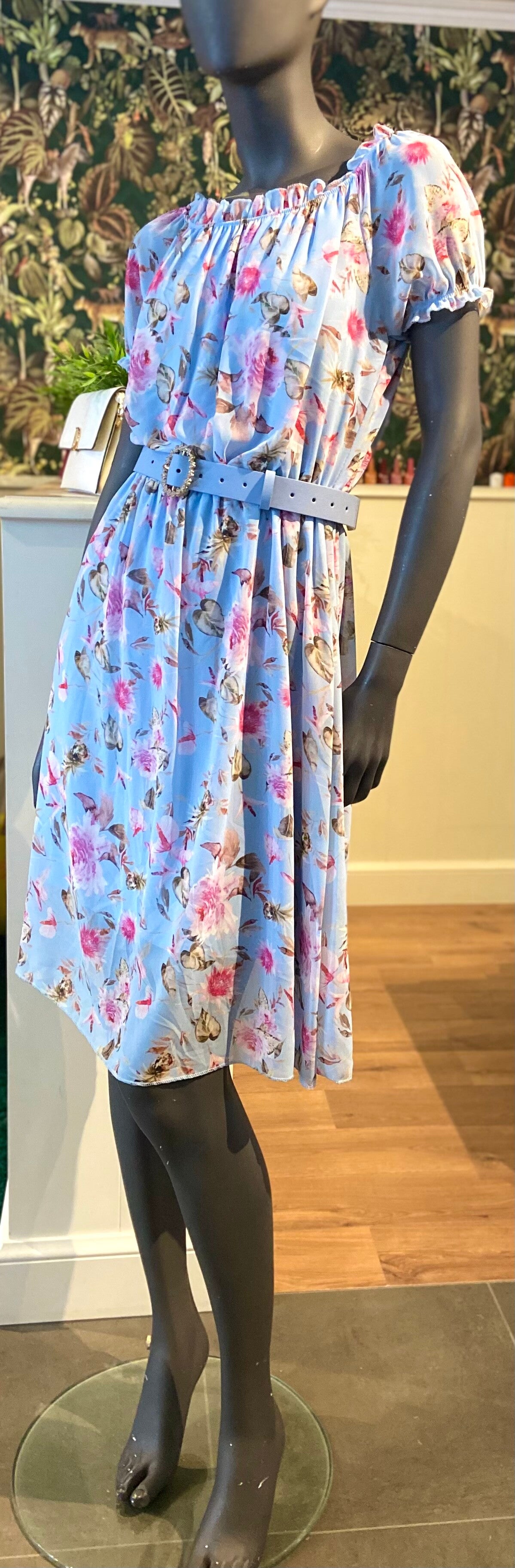 Kleed in fleurige blauwe print, met elastische boord in de lenden.