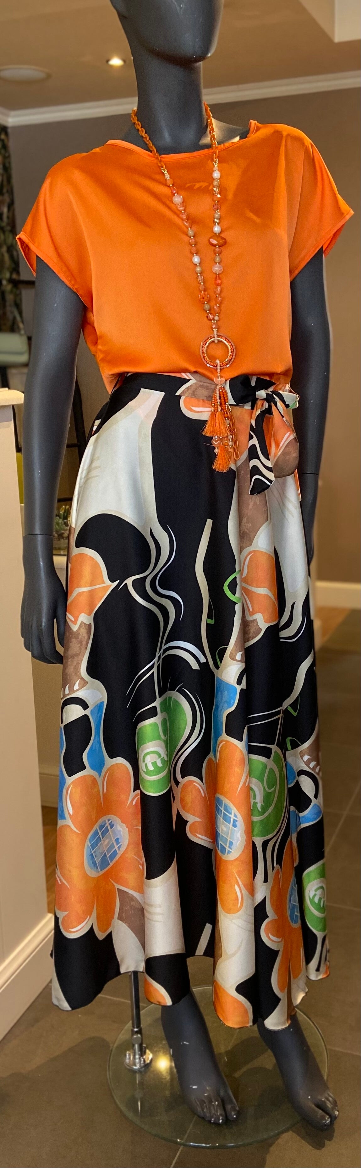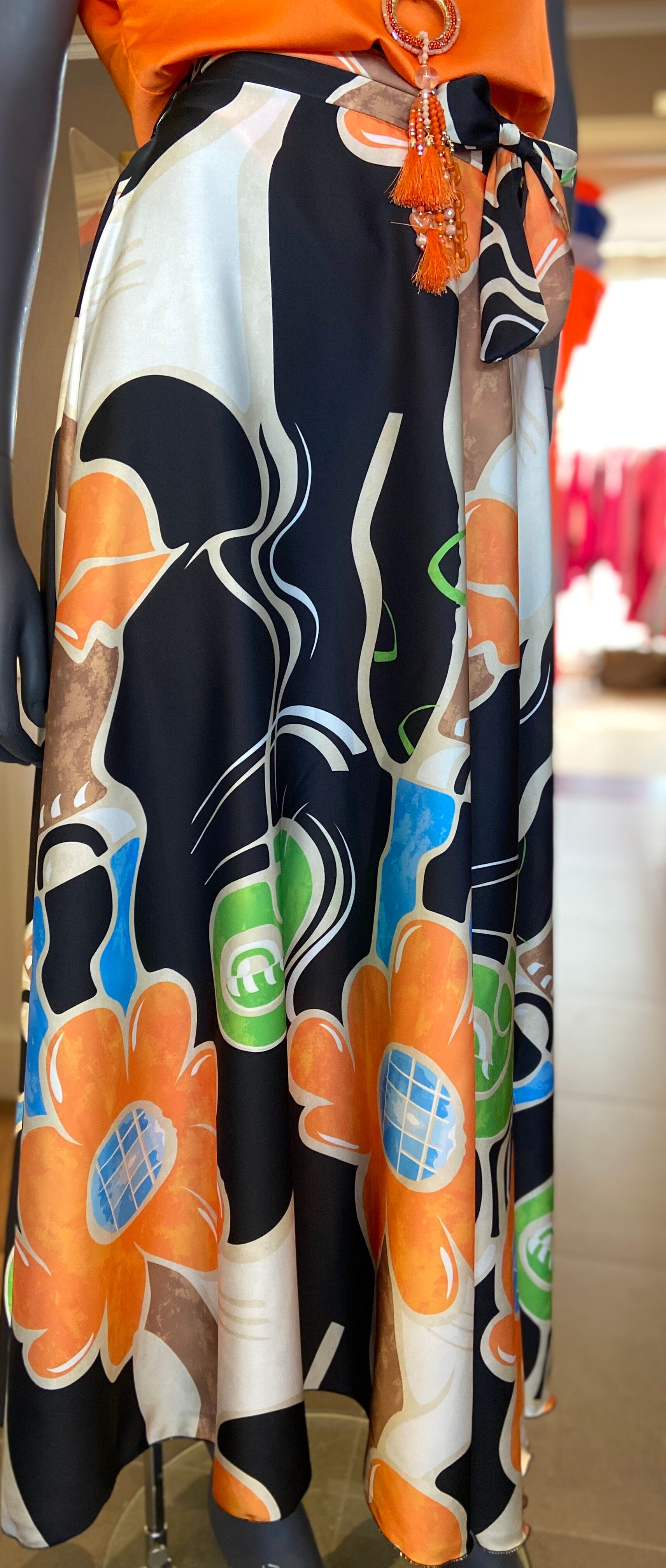 Rok in glanzende stof, leuke kleurenprint