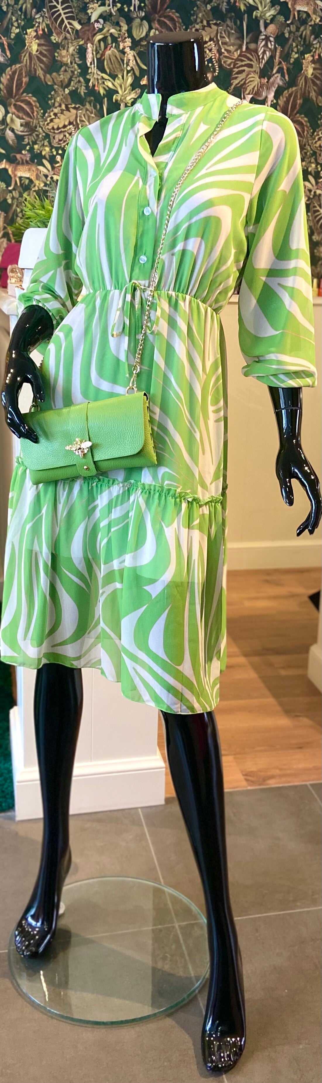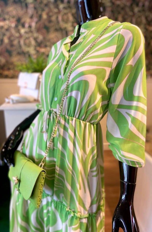 Kleed in groene print, met elastische boord en knopen vooraan.