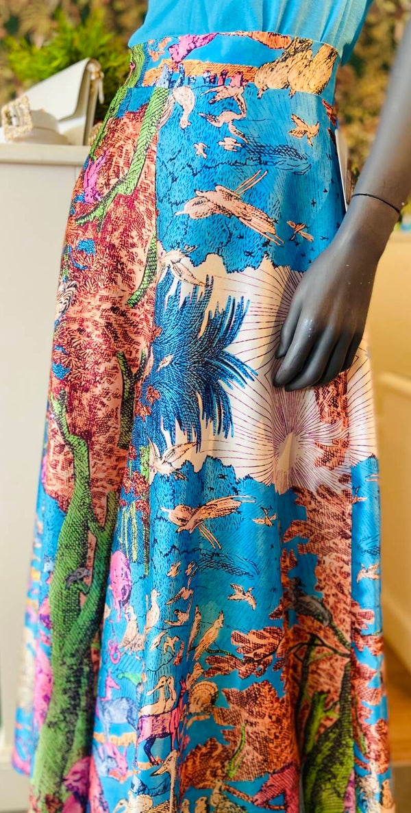 Wijd vallende broek in glanzende stof met kleurrijke opdruk.
