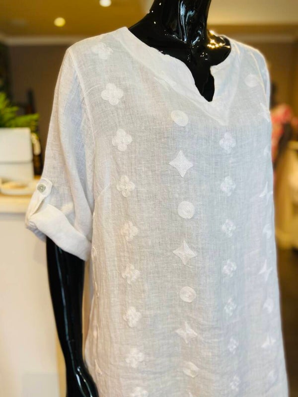 Linnen jurk met geborduurde print, met ingewerkte zakken