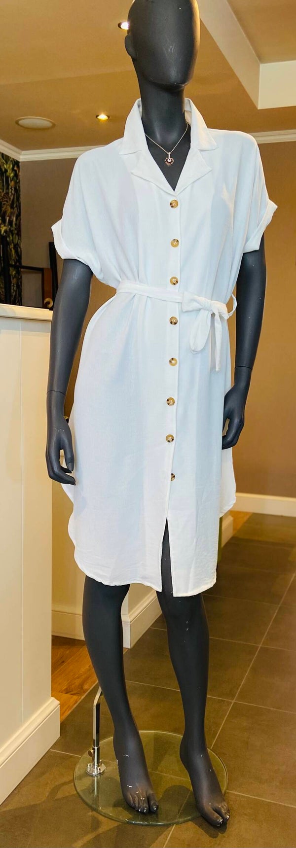 Hemdjurk in wit, afgewerkt met Camel kleurige knopen.