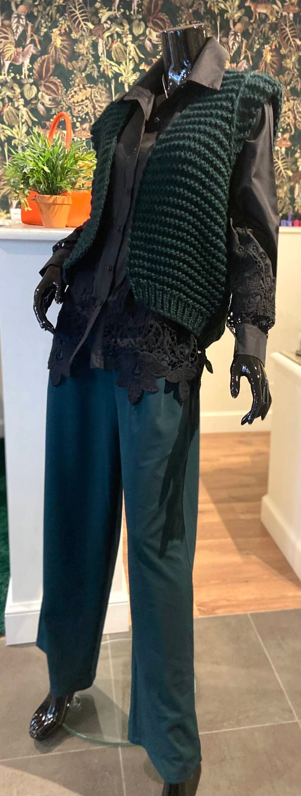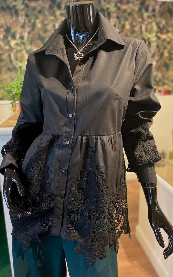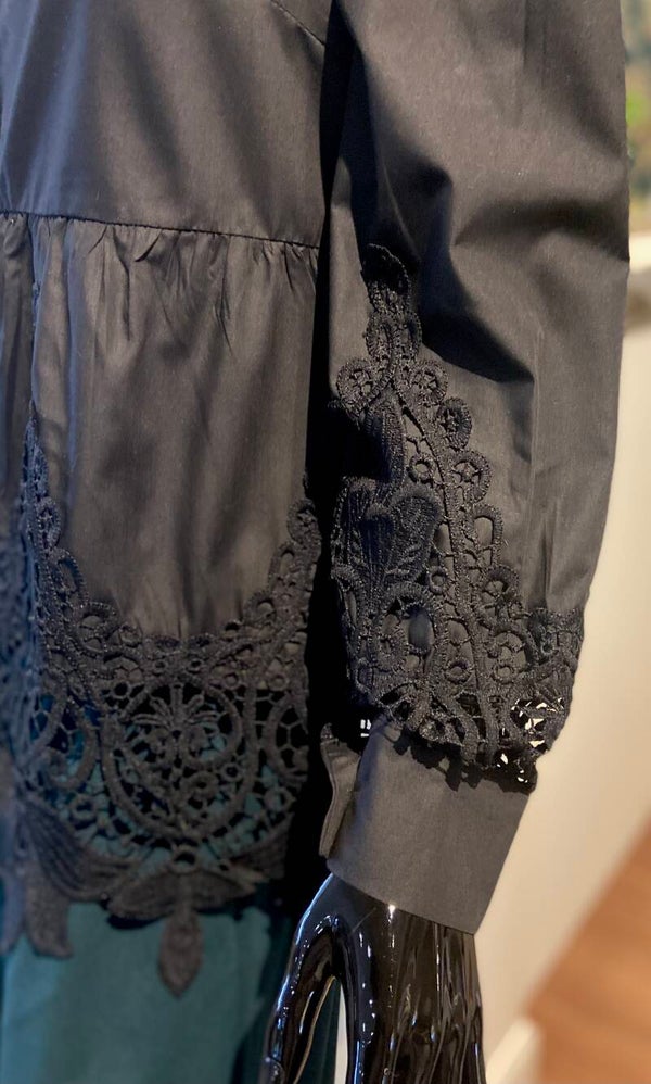 Zwarte bloes afgewerkt met kant aan de mouwen en onderkant.