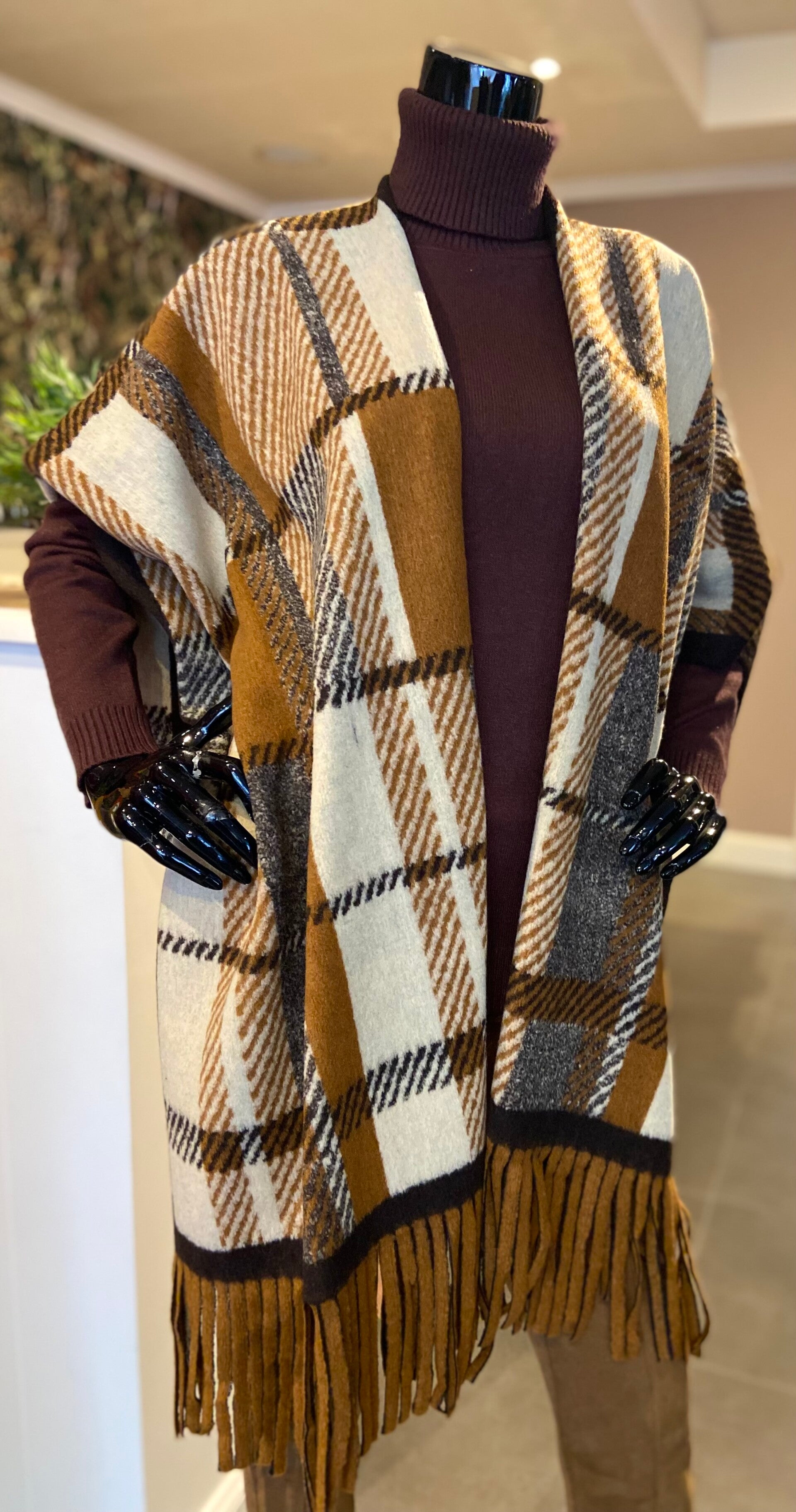 Cape in Camel kleuren, afgewerkt met detail onderaan