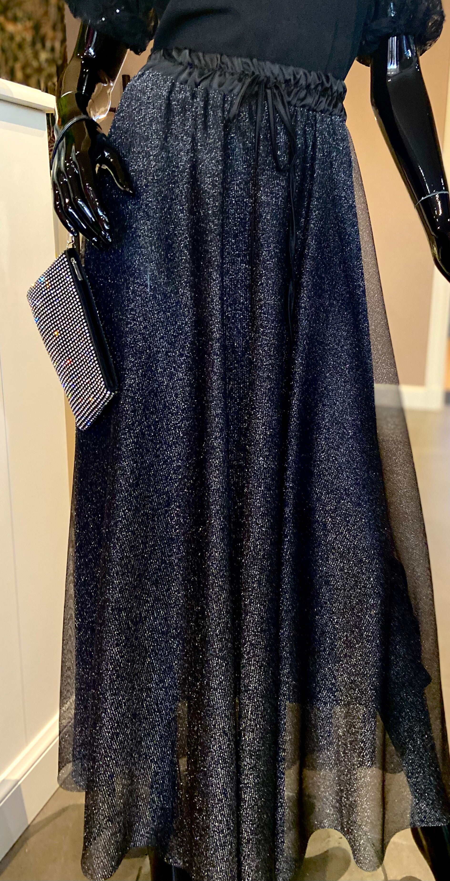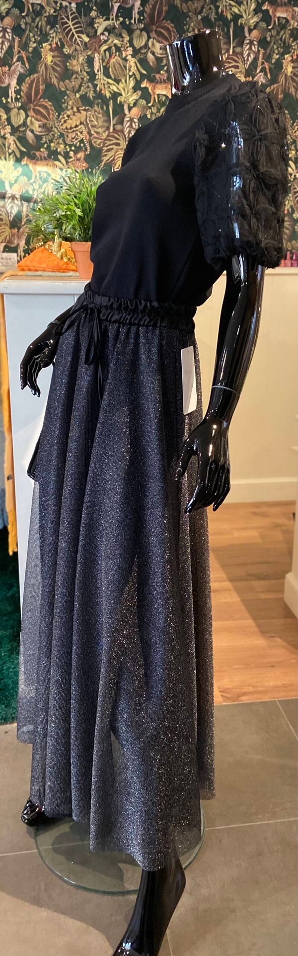 Deze feestelijke rok, in zwart/ grijze glitter stof afgewerkt met satijnen elastische boord en strikje.