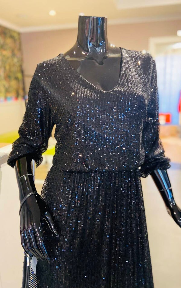 Prachtige jurk in zwarte pailletten, gevoerd.