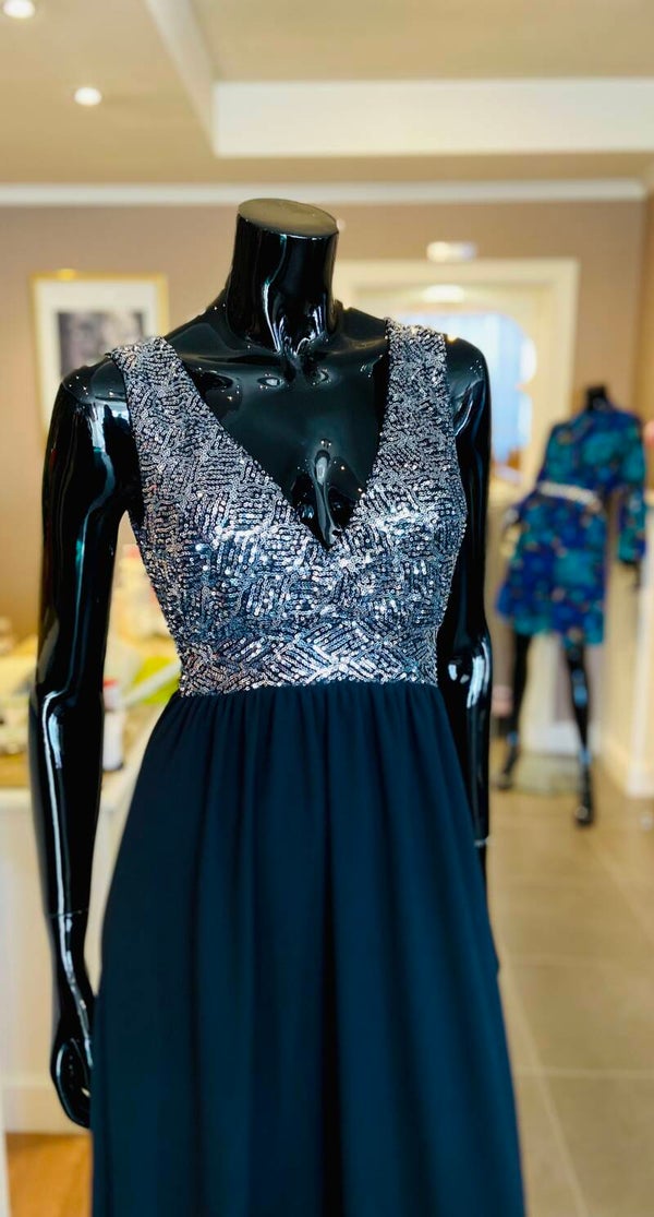 Kleed met zilveren pailletten aan de buste, voorgevormde buste.