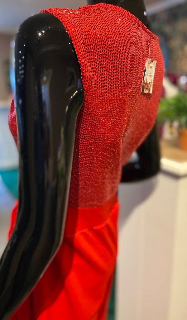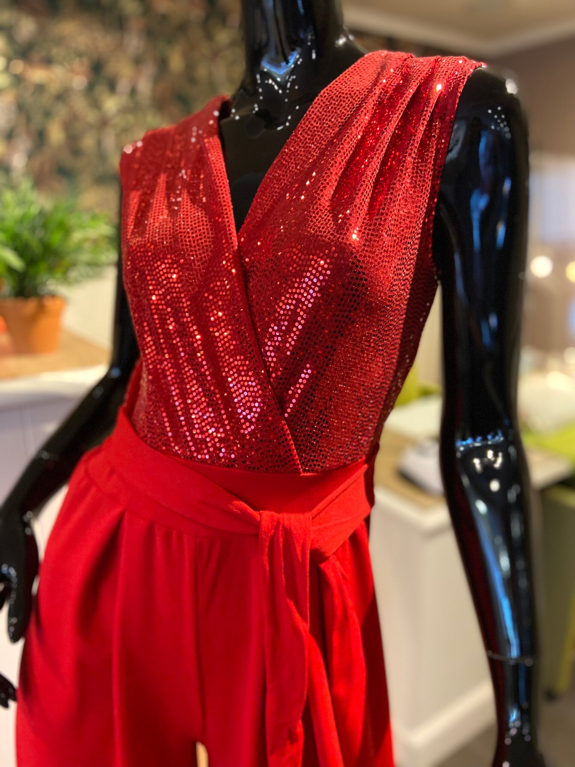 Jumpsuit in rode kleur, bovenstuk in pailletten.