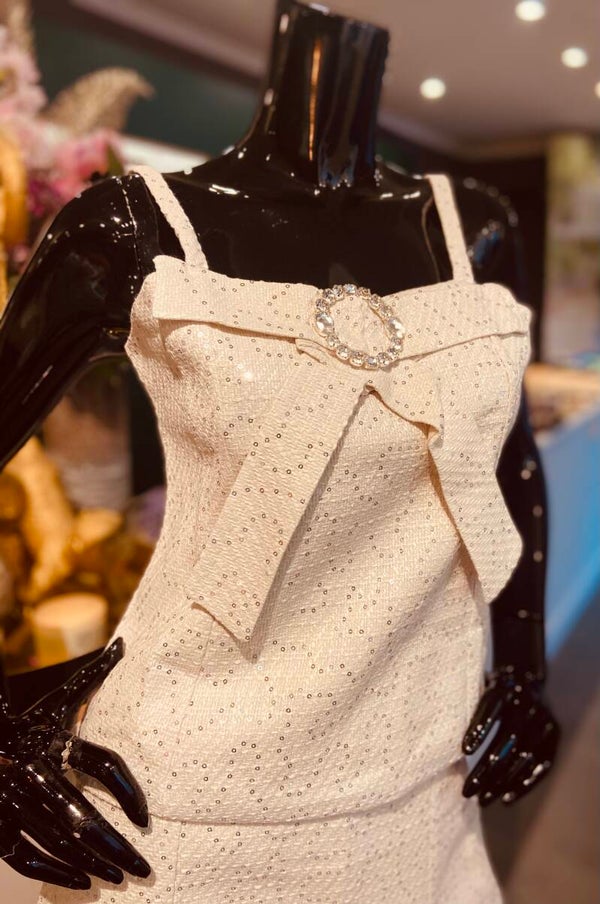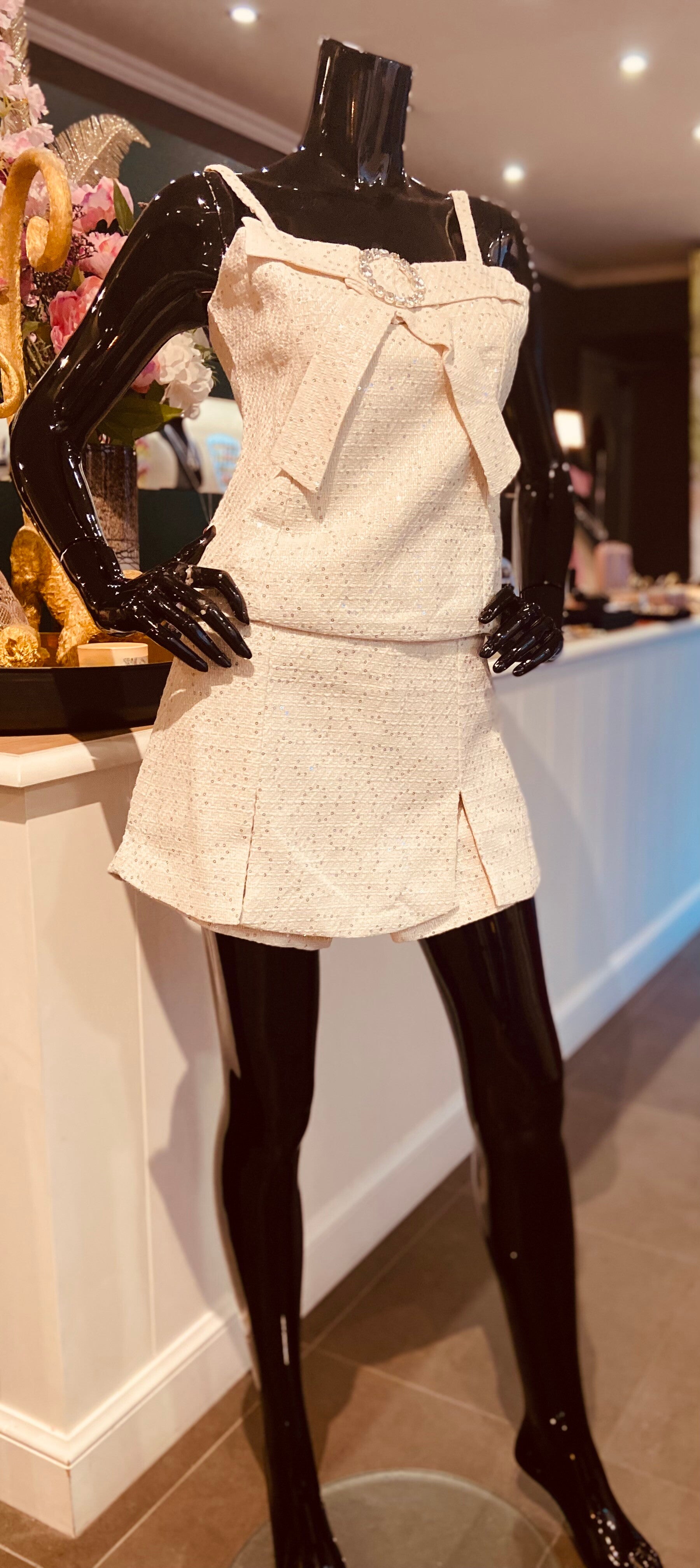 Bustier in gebroken wit met glitter, gevoerd en met rits achteraan.