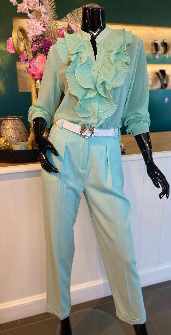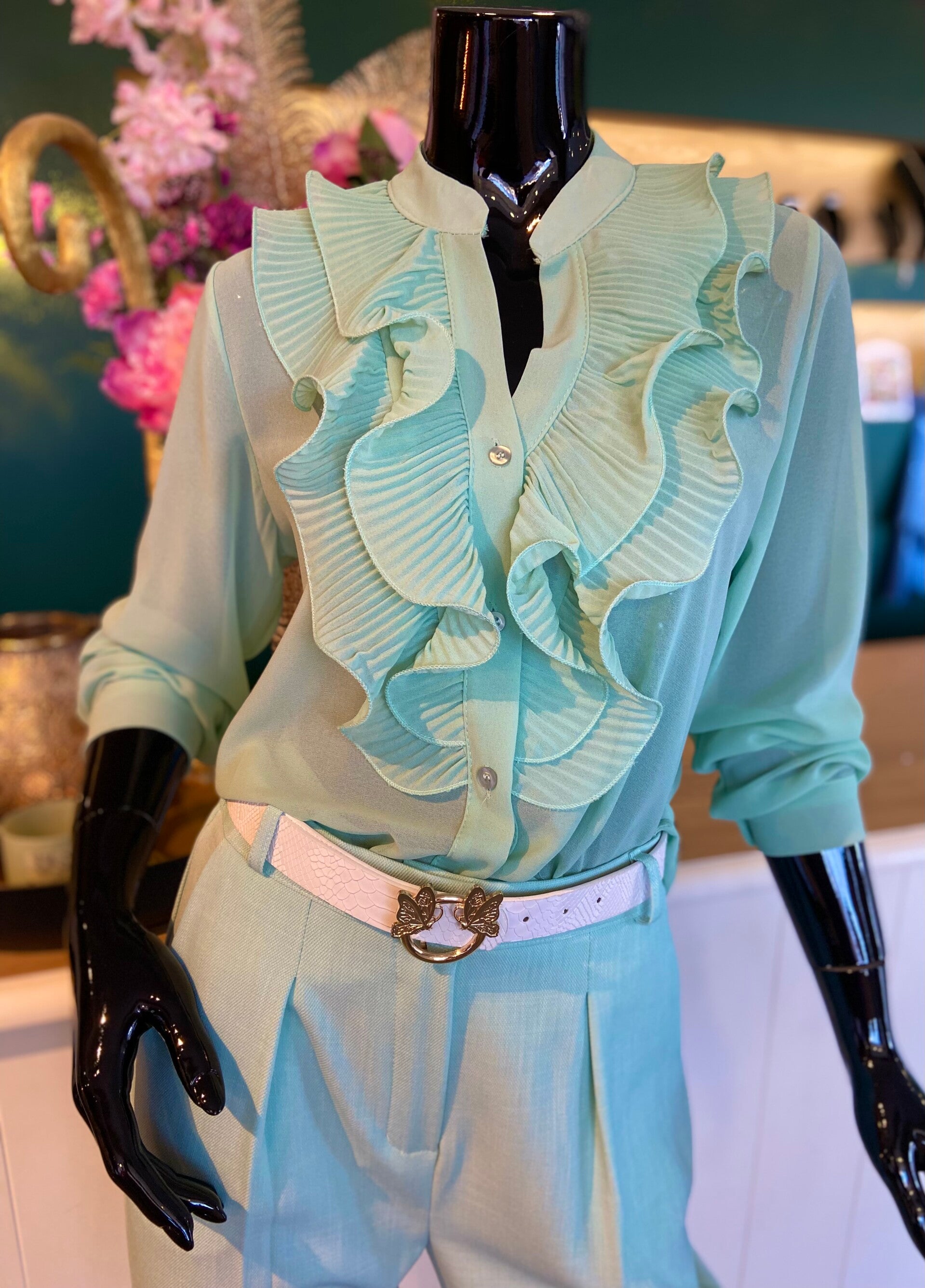 Bloes in soepel vallende stof, met knopen en detail vooraan.