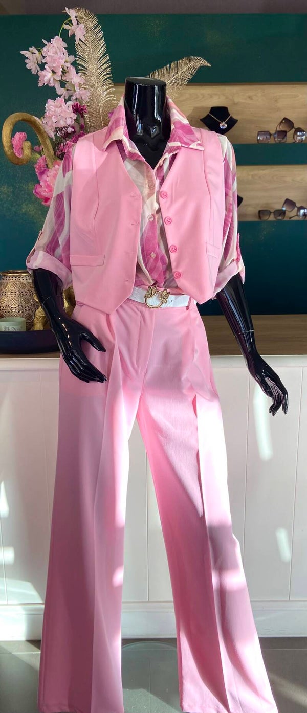 Zacht roze broek met elastische achteraan, rits en knoop vooraan. Zijzakken, wijd model