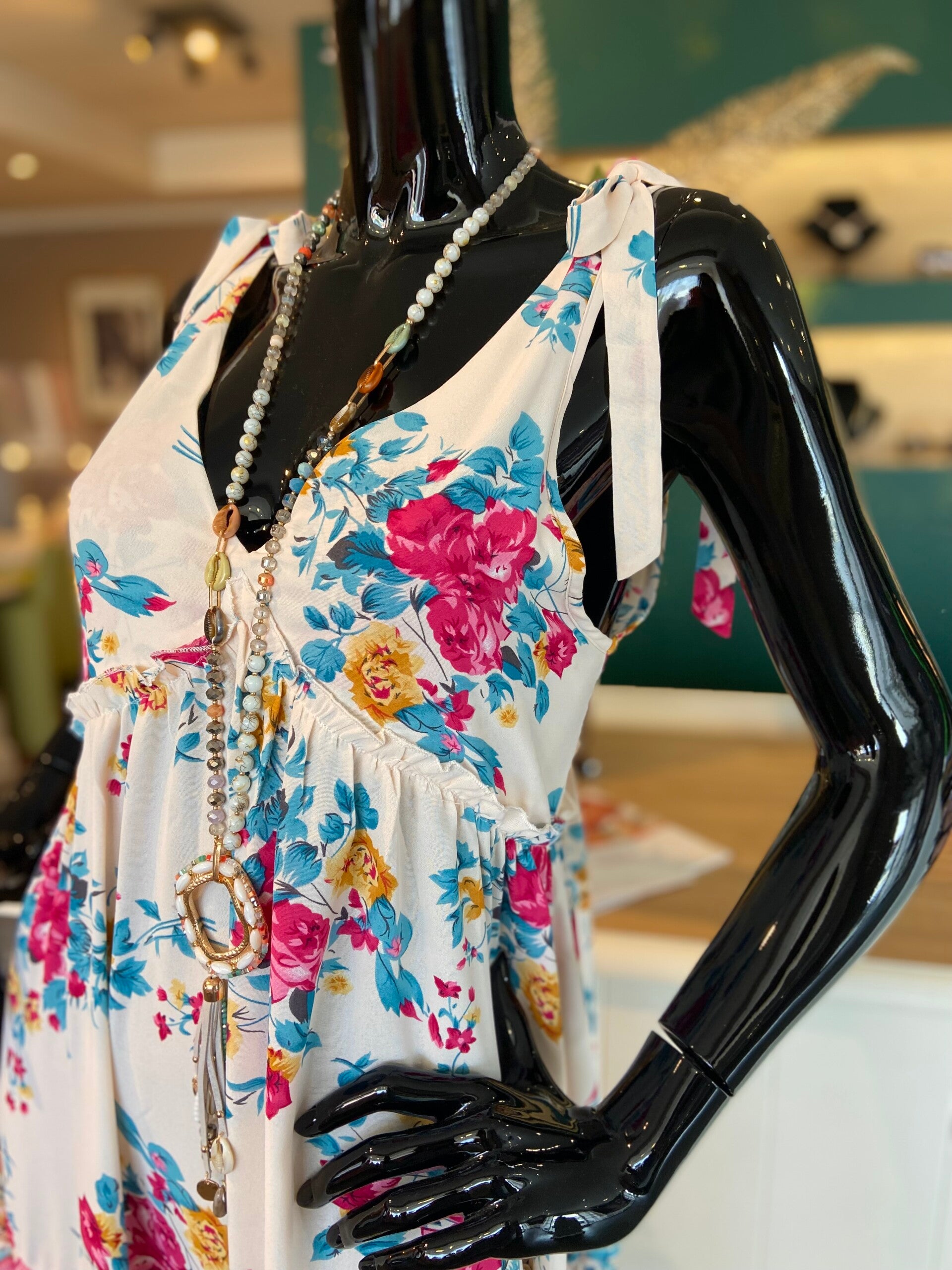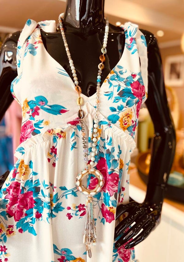 Prachtige zomerjurk in bloemen motief, met strikjes op de schouders.