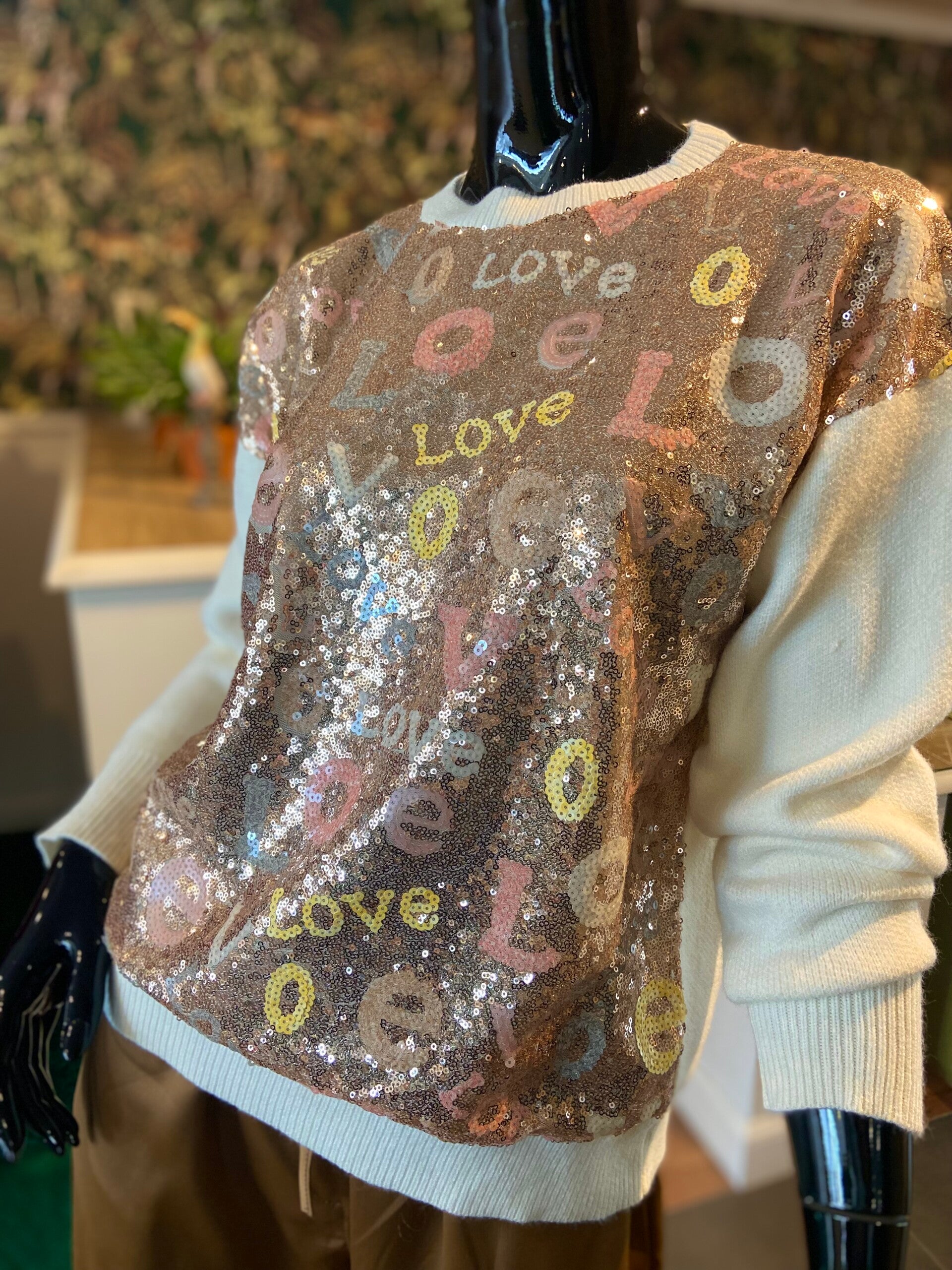 Pull met pailletten vooraan, achteraan gebreid