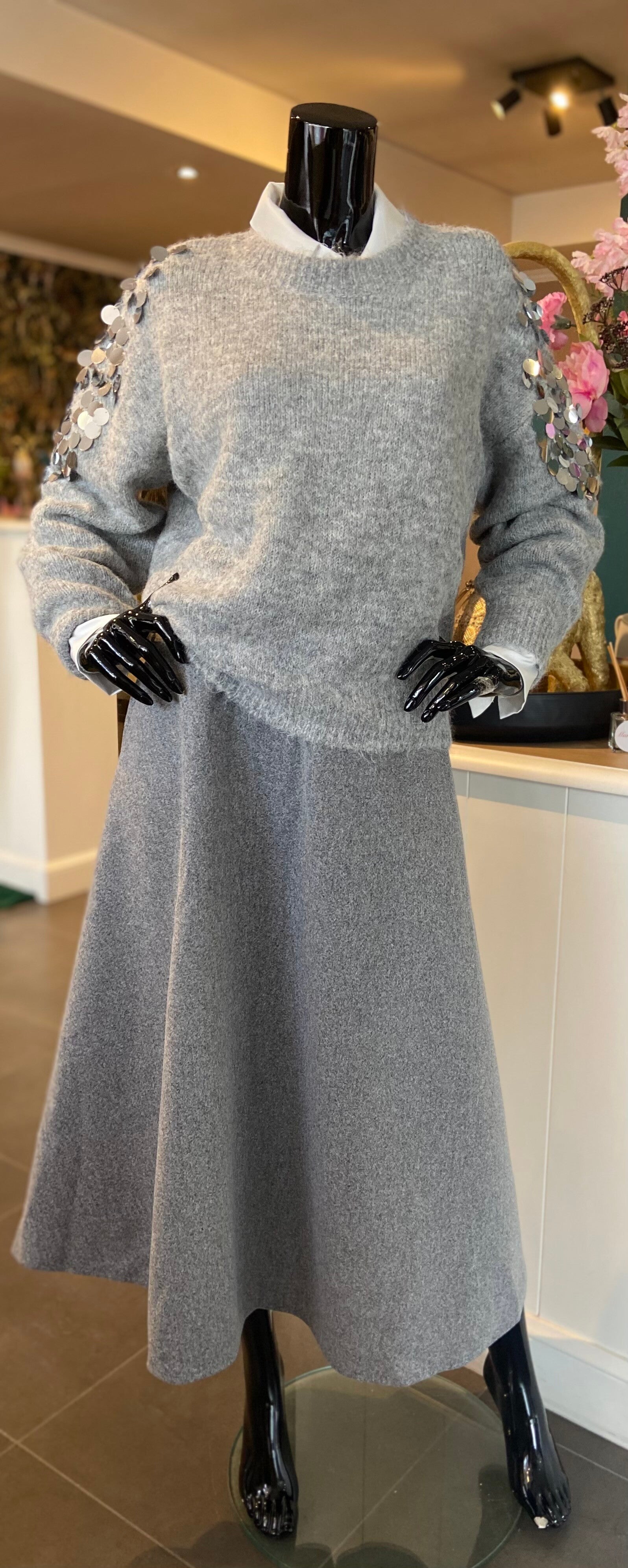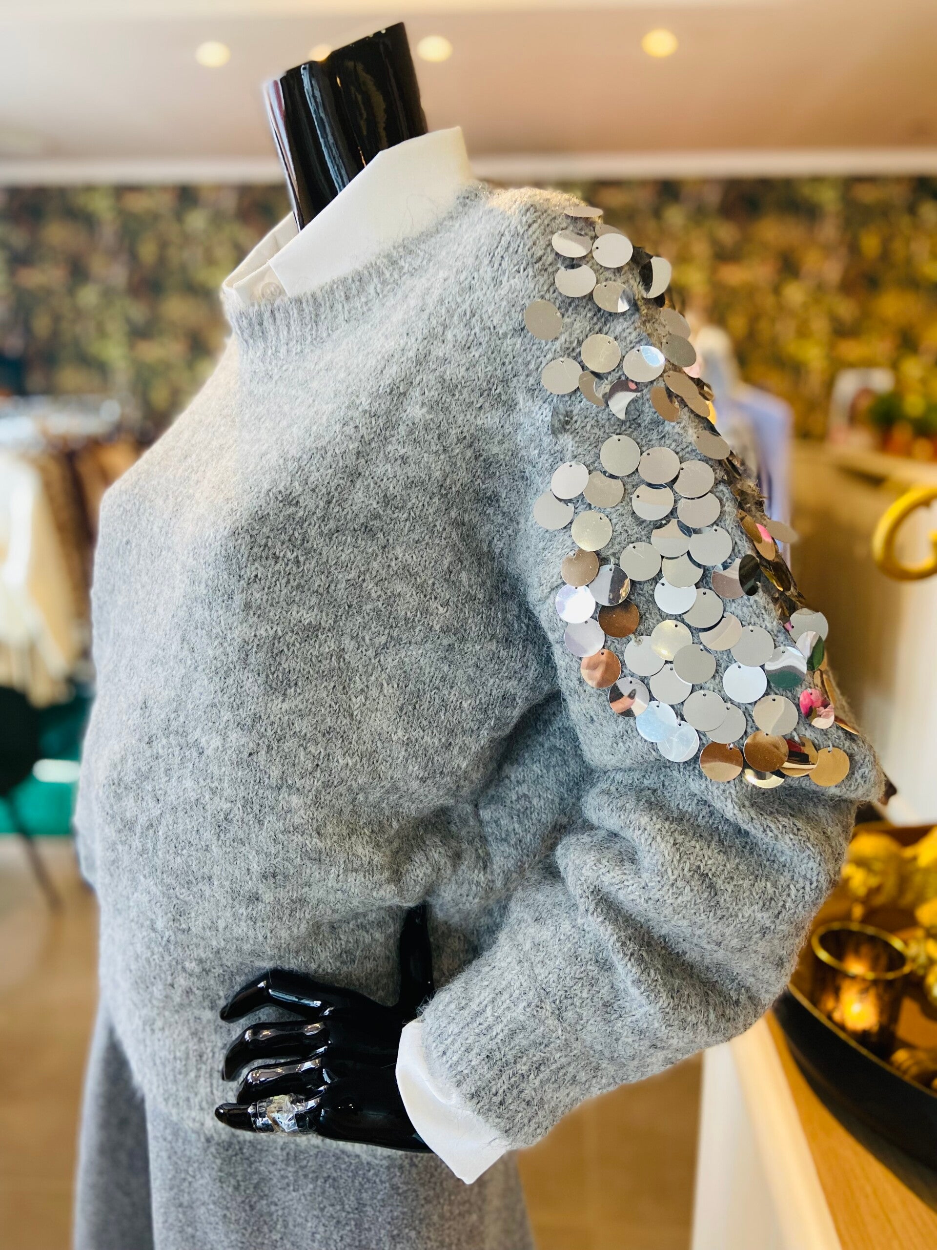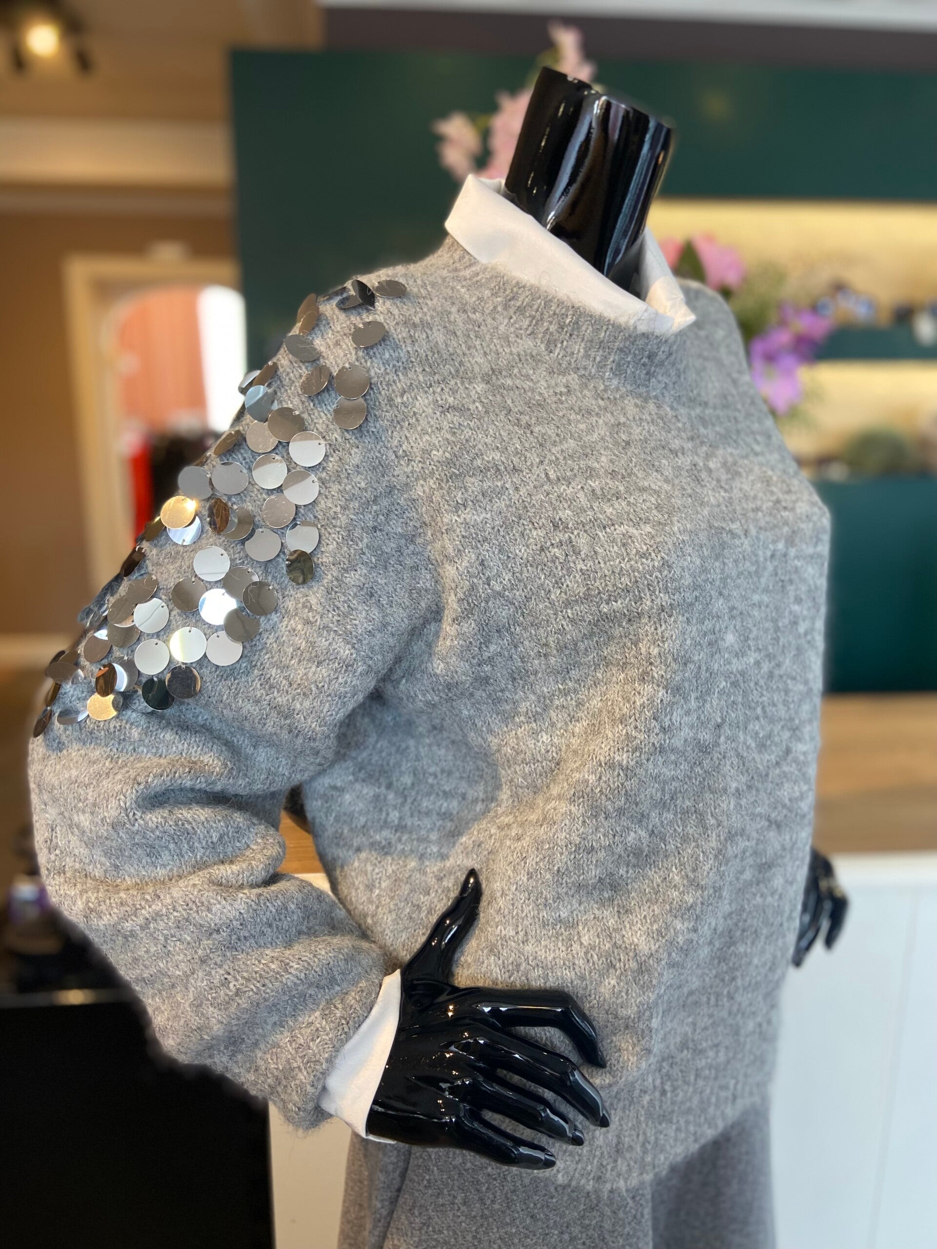 Grijze pull afgewerkt met pailletten aan de mouwen. Heerlijk zacht.