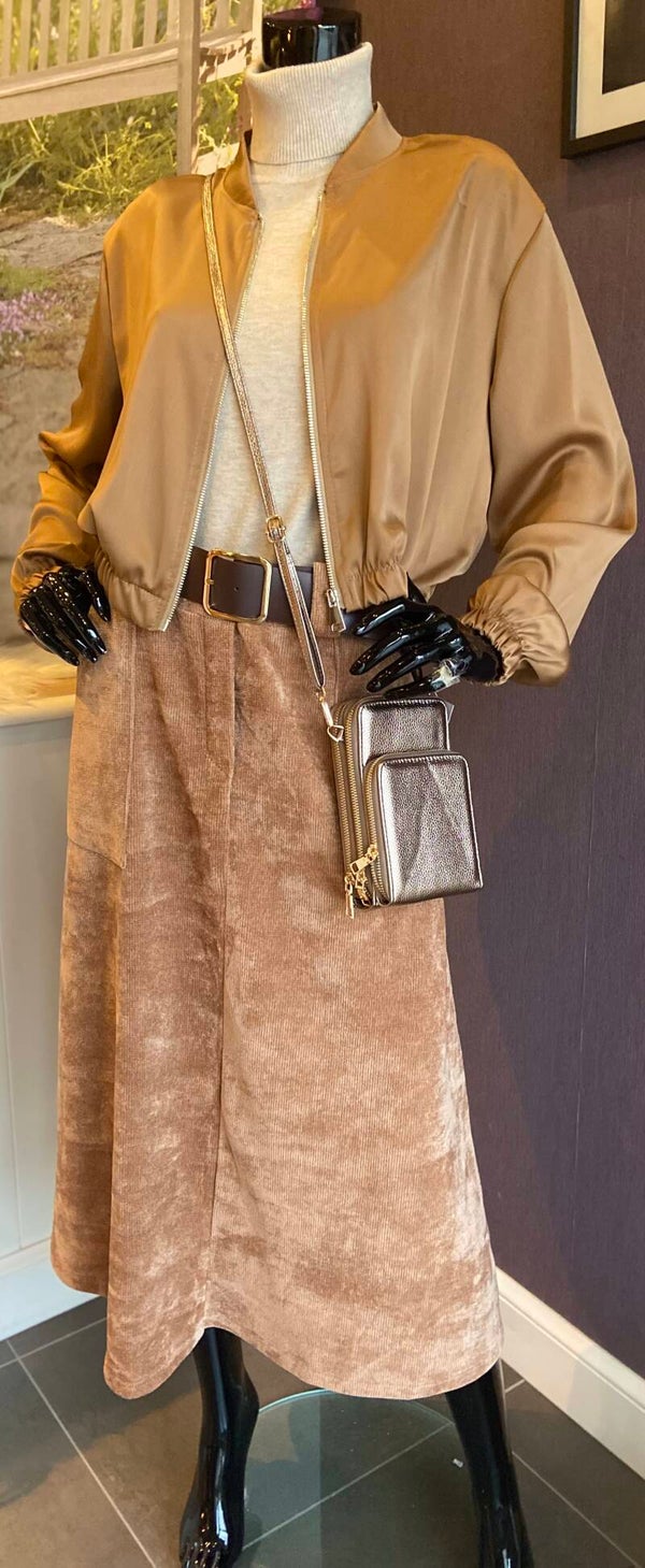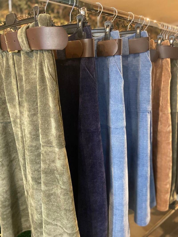 Rok in ribfluweel, bevat stretch. Heel comfortabel dragen. Elastische boord, riem inbegrepen