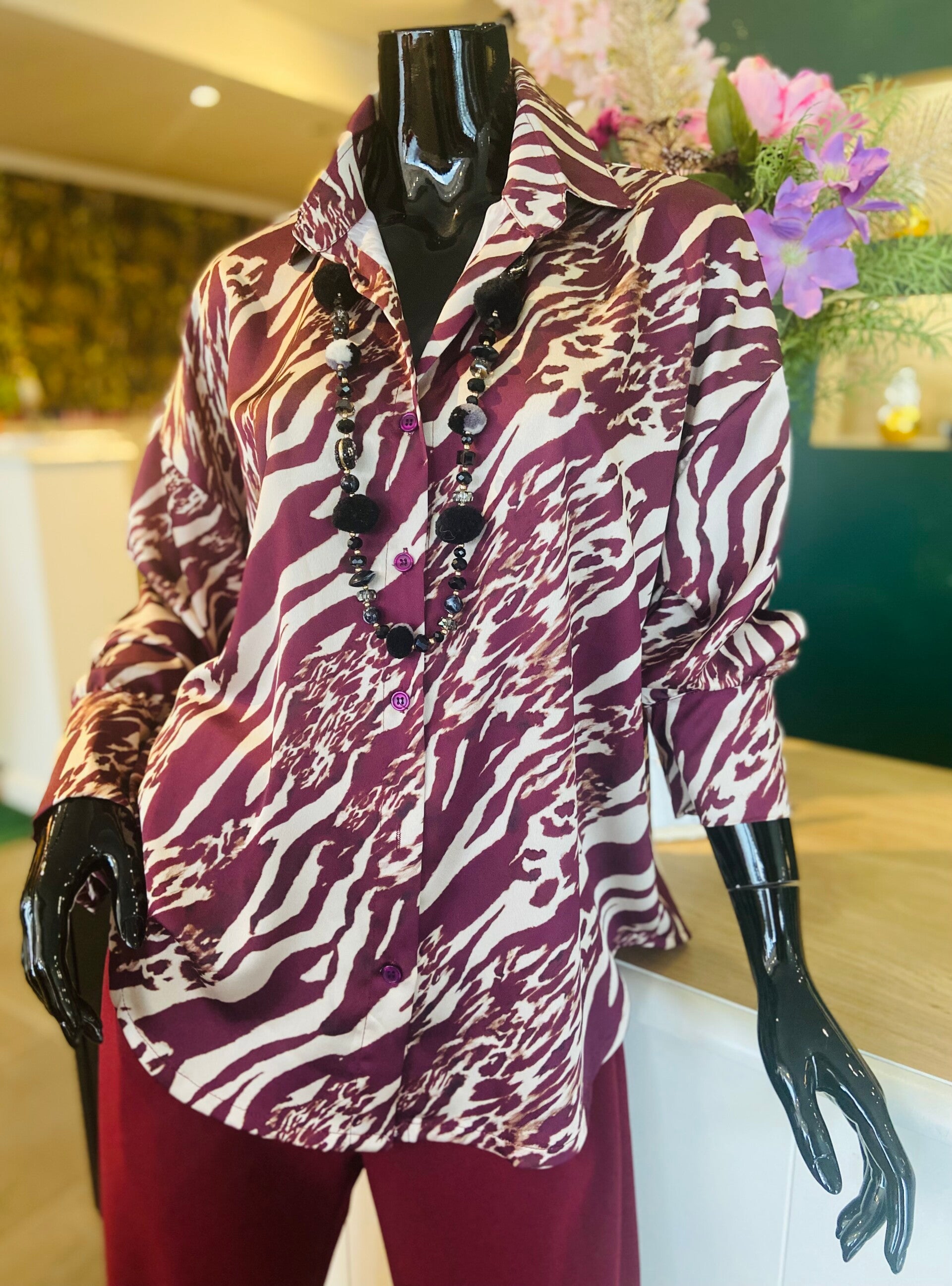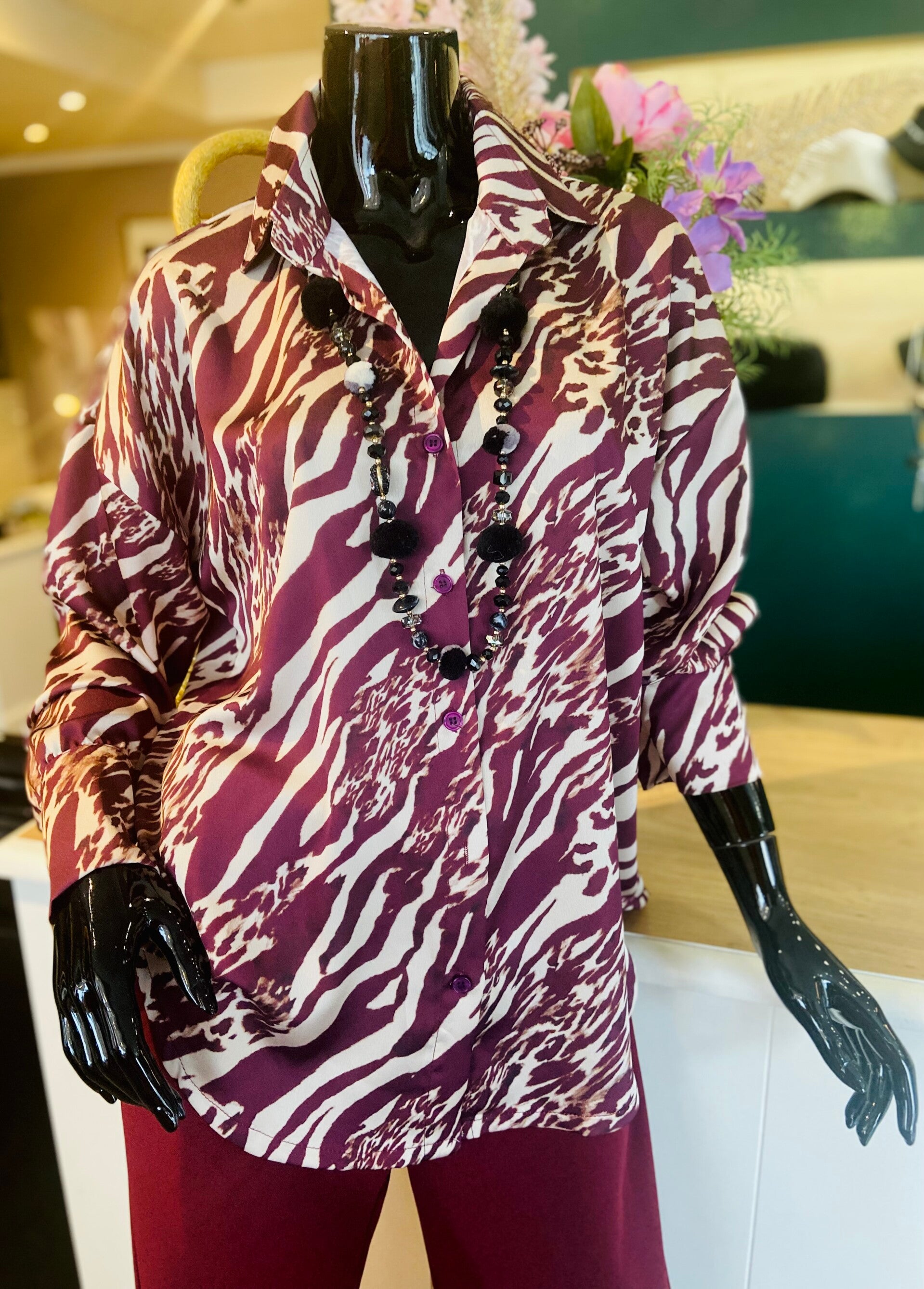 Bloes in soepel vallende stof, Bordeaux motief.