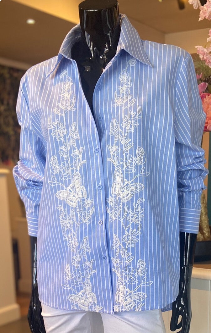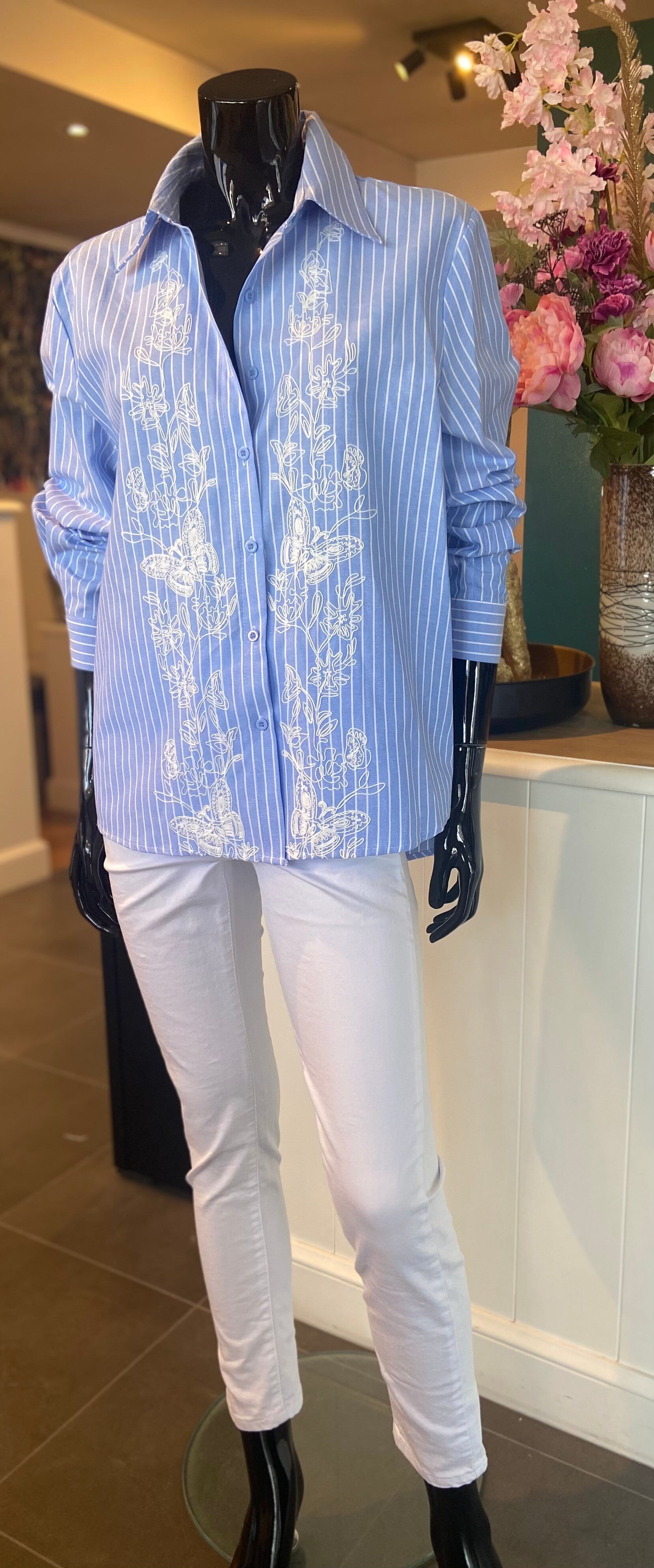 Bloes lichtblauw, wit gestreept met motief vooraan.