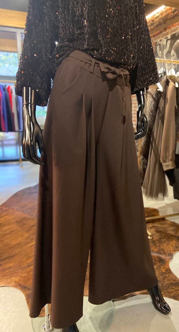 Broek wijdvallend, bruin met elastische boord & lint in de middel.