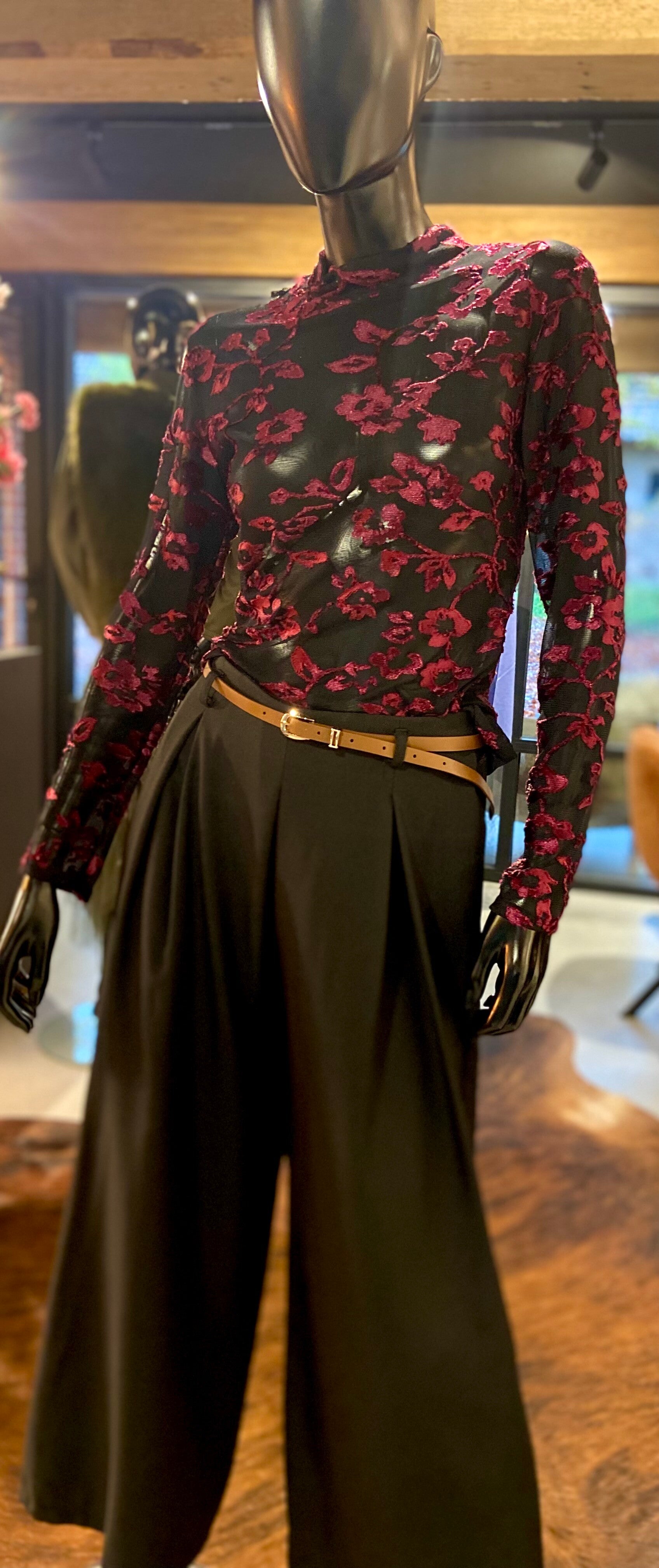 Doorschijnend zwart pull met Bordeaux gestikt motief.