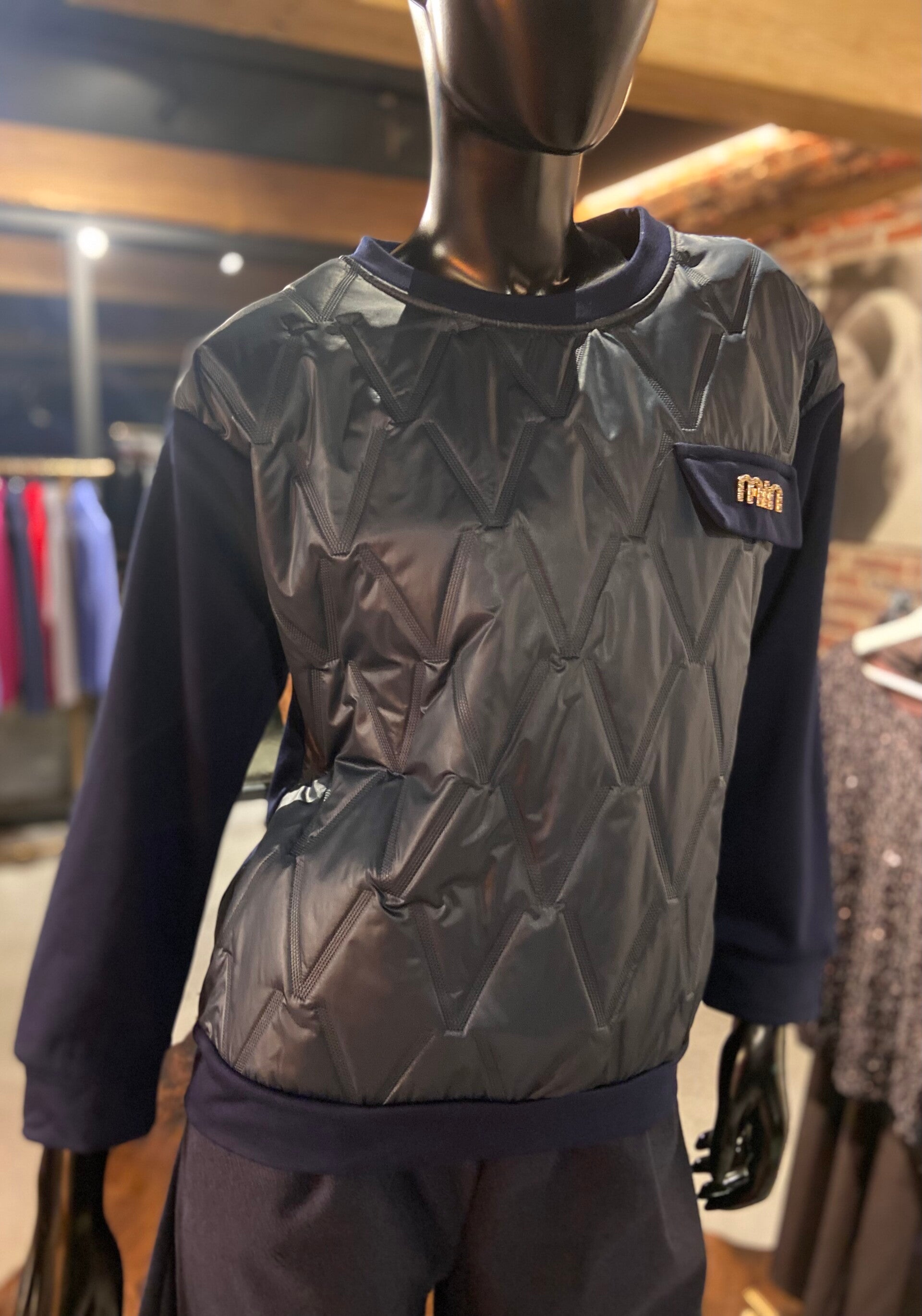 Trendy sweater in donkerblauw met goudkleurige broche & stoffen voorkant.