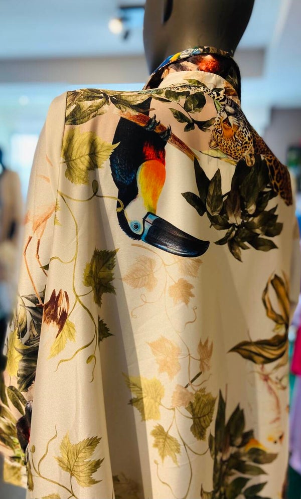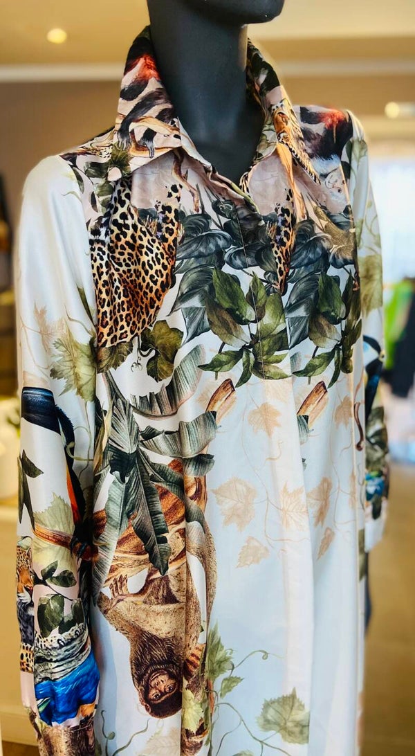 Kleed met leuke print, tailleert ruim.